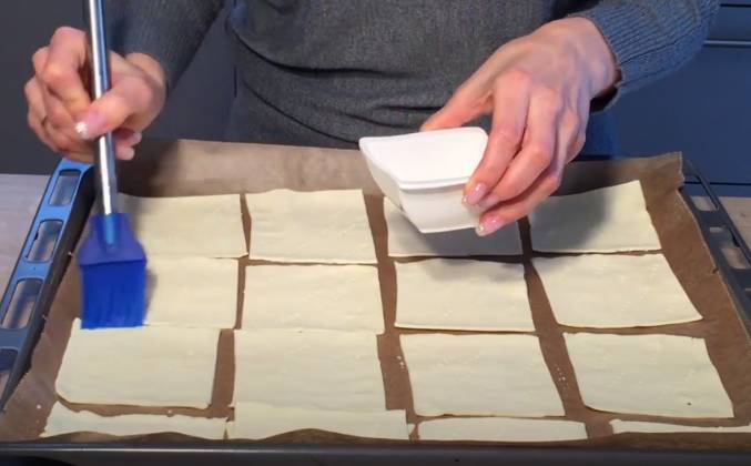 2. Пудинг накрою пищевой плёнкой в контакт. Сделать это надо, что бы на пудинге не образовалась корочка. И поставлю остывать. Теперь займусь тестом. Тесто разрежу на квадраты. Если у вас замороженное тесто, то его надо сначала разморозить. У меня получилось 12 штук и несколько полосок-обрезков. Они нам понадобятся, что бы сделать крошку для присыпки. Нарезанное тесто наколю вилкой и смажу молоком. Пирожные поставлю выпекаться в предварительно разогретую духовку. 200 конвекция или 220 верхний и нижний жар на 13-15 минут до образования золотистой корочки. Пирожные поставлю остывать.