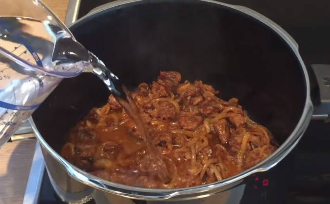 2. Буду обжаривать, мешая время от времени, пока лук не станет золотистого цвета, а мясо не обжарится со всех сторон. Теперь добавлю специи: молотый тмин, майоран, чёрный перец, немного красного перца, сладкий красный перец, соль и томатную пасту. Вместо томатной пасты можно взять мелко нарезанный помидор. Специй не жалейте, они вместе с большим количеством репчатого лука делают суп таким вкусным и пикантным. Мясо с луком я переложила в кастрюлю, в которой буду варить суп. Залью мясо литром воды. Варить суп надо под крышкой на маленьком огне около 1,5 часа.