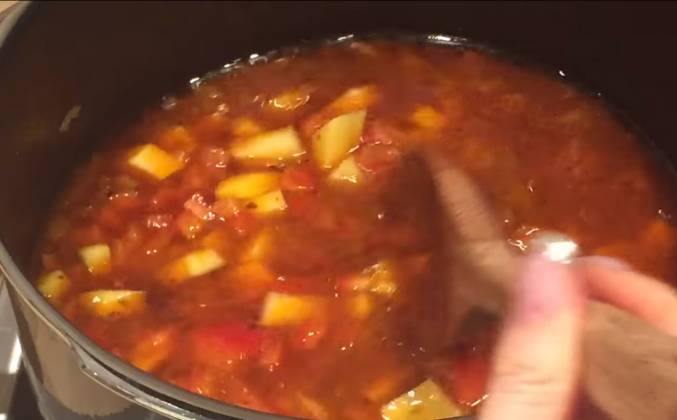 3. Время варки зависит от качества говядины. Поэтому начинайте пробовать мясо на готовность через 70 минут. Пока варится говядина подготовлю овощи. Сначала подготовлю перец. Удалю хвостик вместе с плодоножкой, семечками и белыми перегородками. Теперь разрежу перец на мелкие кубики. Картошку я почистила и нарежу также мелким кубиком. Когда мясо уже станет мягким, надо добавить нарезанные картошку и болгарский перец. И варить, пока картошка не станет совсем мягкой, даже немного переваренной. Наш суп готов. Подают суп-гуляш к столу горячим, ещё дымящимся с большим куском ароматного чёрного хлеба. Приятного аппетита!Видео рецепт ютуб ниже 👇