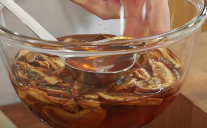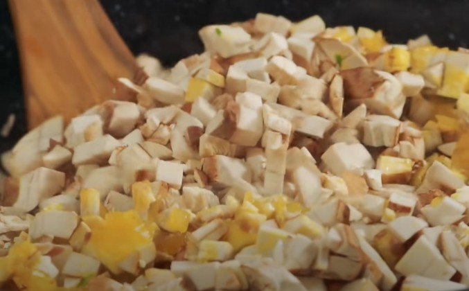 2. Здесь скорее надо очень аккуратно, не растеряв запах грибов, удалить эту влагу для того, чтобы и грибы, и лук, который я сейчас жарю, несколько уменьшились в объеме, но сконцентрировались в своем вкусе. Вы понимаете, когда было продуктов вот столько, а стало немного, то его вкус ровно во столько раз и умножился. Лук хорошо выпускает сок, но мне необходима дополнительная влага для того, чтобы лук как можно скорее размяк. И я беру воду, в которой замачивал сушеные грибы. Эти грибы называются шиитаке. Они продаются во многих супермаркетах. Они хорошо хранятся, могут лежать полгода-год и практически не теряют ни свой вкус, ни свой аромат. Даже вода, в которой они стояли, уже окрасилась в такой красивый грибной цвет и имеет грибной аромат. Так пусть вот этот аромат вот здесь с луком вместе уже и работает. А мы начинаем работать с мясом. Перво-наперво от вырезки я хочу отделить жир. Посмотрите, какой жир красивый. Этот жир мне понадобится для того, чтобы рулетики обжаривать. Вы сами посудите, он же неслучайно растет вместе с вырезкой. Нам как бы подсказывают: бери этот жир и жарь на нем вырезку. Мясо будет обжариваться недолго, потому что это вырезка. Ее нельзя долго жарить, ее надо готовить очень быстро.