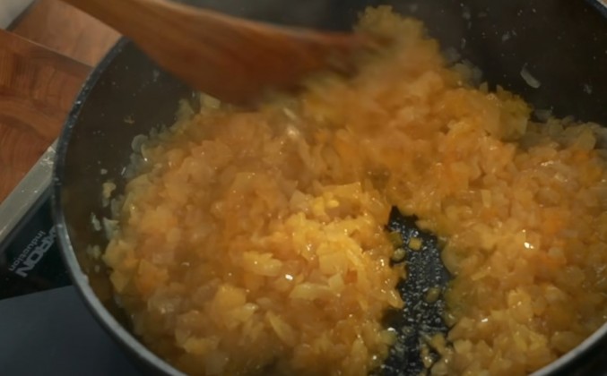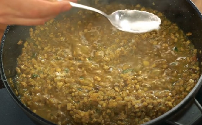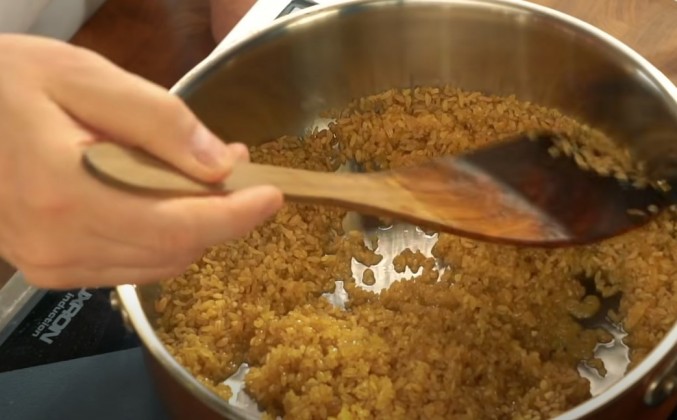 5. Видите, какой лук получился? Как будто бы в него кто-то мед налил. Но мед в него никто не наливал, мы его просто правильно и хорошо пожарили, подготовили. И теперь он готов принять немного, буквально 2-3 щепотки свежей зелени. Положите ту, которая вам нравится. Вы можете мяту положить, можете петрушку положить, а я положу кинзу. Грибы. Вот оно, время для грибов. Перемешать с луком, убавить нагрев и накрыть крышкой. Пусть потихоньку выпускают из себя лишнюю влагу, чтобы они за это время и пригореть не успели. Вот это да! Какой запах, какой потрясающий запах. Замечательный запах, но теперь можно немного испарить лишнюю влагу, потому что все-таки это должен быть фарш. Осталось посолить и приправить. Соль у меня вот она. Здесь довольно много. Наверное, здесь около 1 кг фарша. И поэтому я добавлю 12 г соли. И пахнет это настолько круто, настолько хорошо, что если и приправлять чем-то, то, может быть, только сметаной. Да, сметану положу прямо сюда. Перемешать, нагреть, но уже ни в коем случае не кипятить. Сметана не должна свернуться, сметана должна только смягчить наш будущий фарш. Дальше этот фарш будет только томиться, а я хочу добавить к этому фаршу еще одну приправу. Это трюфельное масло. Да-да, я знаю, что здесь по сути дела химическая эссенция, которая имитирует трюфельный запах. Но формула молекул, из которых состоит эта эссенция, та же самая, что содержится в настоящем трюфеле. Поэтому запах будет очень похож. Перемешаем. Если у кого-то найдется настоящий трюфель, добавляйте, не жалейте, получится что надо. Послушайте, а не слишком ли жирно получается? Больше 1 кг самой лучшей части вырезки, 200 г сметаны. Очень жирно. Поэтому я беру еще одну хорошую ложку топленого масла и опускаю его в сотейник. Мы будем гарнир готовить. А на гарнир у нас будет не что попало, на гарнир у нас будет булгур. Булгур "Националь", пожалуй, самый лучший булгур, который мне только встречался в наших торговых сетях. А посмотрите, полюбуйтесь, каков он. Стакан 250 г, 250 мл. Ровно стакан булгура возьму. Посмотрите какой булгур, полюбуйтесь какой булгур. Золото, а не булгур! Пересыпаем это золото в другое золото, в золото топлёного масла. Обжариваем булгур до тех пор, пока не пойдет приятный вкусный запах. Посолить надо булгур. Я думаю, примерно 1 чайной ложки соли хватит. Вы помните, я говорил вам, что булгура было ровно 250 г. А вот здесь у меня ровно 0,5 л хорошего, отличного золотистого говяжьего бульона. Можно и воду тоже налить, тогда, может быть, чуть посолить придётся сильнее. Можно налить овощной бульон. Сварить его очень просто.