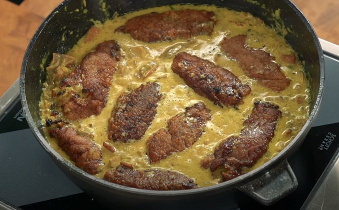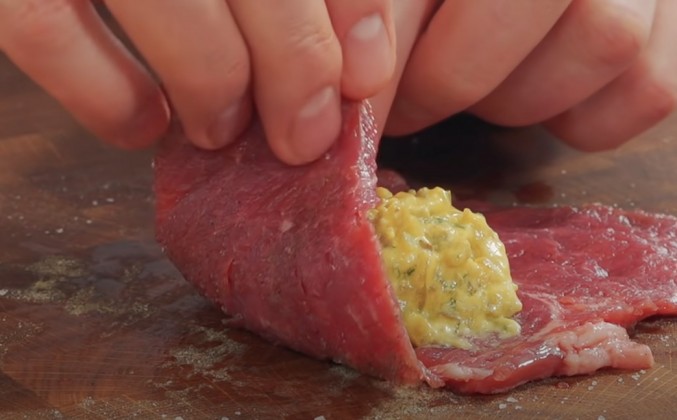 4. Потому что часть веществ из куркумы растворяется во влаге, а часть растворяется в масле, как и любые другие специи и ароматные продукты. Начинаем делать заготовки для рулетов. Вы знаете, мясо я бы отрезал вот так, примерно 1-1,5 см. Но что можно завернуть в такой кусочек мяса? Да ничего, я вам честно скажу, ничего. Поэтому я укладываю его плашмя, надрезаю, но не разрезаю до конца, и разворачиваю вот так, как книжечку. Надо взять что-то, чем отбить мясо. Только не надо бить со всей силы. Вырезка мяса очень нежная. Его фактически ладошкой можно расправить так, чтобы оно... Посмотрите. Чем вам не виноградный листик? Конечно, получится долма. И вот так и продолжаем. Наверное, может возникнуть вопрос: обязательно ли надо брать вырезку, все-таки мясо достаточно дорогое? Ну, можно взять еще и филе со спины, но то, что это мясо должно быть прямо высшей категории, это уж совершенно точно. Потому что если взять какое-то другое мясо, то и готовить надо как-то по-другому. А для этого блюда подойдет только то мясо, которое 3-4 минуты жаришь, и оно готово.