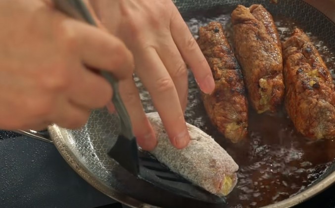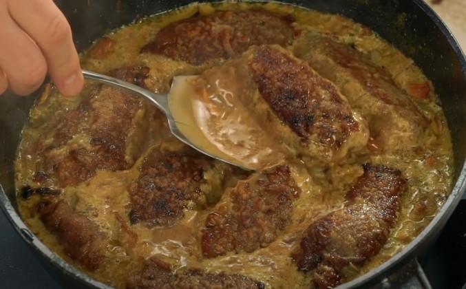 7. И к этой соли я сразу добавляю правильную пропорцию черного перца. Я думаю, что примерно пол-ложки будет достаточно. И перемешаю. Я буду приправлять сразу и солью, и перцем для экономии времени. Немного соли и перца прямо на доску для того, чтобы рулетик снаружи тоже оказался и соленым, и перченым. Ложки грибов будет вполне достаточно. Заворачиваем, как бы стараясь сделать конвертик. Обвалять в муке. Жир на сковородке надо нагреть очень сильно, буквально до дымка. Не бойтесь ничего. Котлеты, а у нас фактически получились котлеты, должны обжариться очень быстро и получить снаружи уверенную твердую корочку. Каждую котлету укладываете швом вниз. Это очень важное условие. Если положите швом кверху, то мясо начнет изгибаться, шов и раскроется. Сильнее жарить не надо, буквально 2-3 минуты. Посмотрите, сколько соуса осталось. Вы думаете, что я не рассчитал? Нет, я как раз все очень хорошо рассчитал. Мы сейчас этот соус снова должны подогреть, и немного развести его вот этой грибной водой.