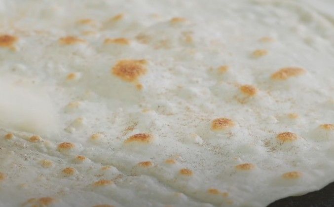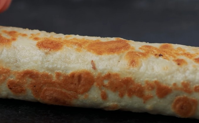 4. И начинаем раскатывать. Нарезаем заготовки размером со сковородку. Видите, у меня лавашики получаются прямоугольные, и сковородка как раз квадратная. Все как надо. Но у кого сковородка круглая, тому, конечно, лучше скалкой раскатывать круглые заготовочки. Надулись пузырьки, переворачиваем. Нам не надо пропекать этот лаваш полностью, нам надо его только слегка подсушить. Готовый лаваш нельзя оставлять на столе, надо его убирать под полотенце. Вот пусть здесь слоями и лежит. К концу стали получаться. Посмотрите, какие они. Прямо как положено, лаваш-прелаваш. Но это еще не все. Лаваш с фаршем - это еще не готовое блюдо, которое я задумал. Смотрите, что мы будем делать сейчас. Вот форма для выпечки. Эту форму сначала чуть-чуть согрели, смазали сливочным маслом, а потом охладили. И сливочное масло застыло на этой форме. Это то, что нам нужно. Теперь мы берем лаваш. Понятное дело, он еще не до конца допеченный, хотя многие любят именно такой. Мы берем немного фарша. Вот больше не надо, я вас уверяю. А этот край смазываем топленым маслом и сворачиваем в трубочку. Давайте прикинем, какой глубины у нас форма. Да вот, практически одна фаланга. Так и нарезаем.