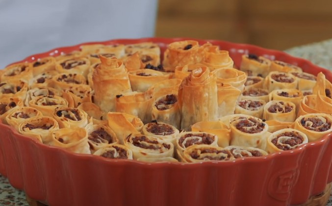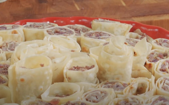 5. Ну вот, последние трубочки. Буквально пару ложек фарша лишние остались. А лаваш всегда пригодится. Например, я вот этот лаваш посушу и буду с ним хаш кушать, буду его в бозбаш класть. Вы знаете, что такое бозбаш? Недавно был у нас ролик "Каурма-бозбаш". Вот здесь ссылка есть. Посмотрите, кто не посмотрел. Я могу сказать, что азербайджанскую пахлаву все любят, и женщины, и дети, и мужчины тоже любят. Но найдется, я точно знаю, что найдется очень много мужчин, которым вот такая пахлава мясная придется по вкусу еще больше. Пойдемте в печку. Это еще запечь надо, чтобы каждый рулетик, чтобы каждая пахлавушечка, каждая сушечка, это же суши, это азербайджанские суши, чтобы каждая сушечка зарумянилась, захрустела. А мы ее тогда еще раз топленым маслом сверху польем. Посмотрите, фарша осталось ровно на одну штуку. Ну, расчет у меня на 50% немецкий, поэтому так. Но есть у меня одна идея. Блюдо, которое я сегодня готовлю, экспериментальное. Я его прямо перед вами первый раз в своей жизни готовлю. И у меня появилась вот какая идея. Сковородка-то есть. Ладно, туда не поместилось. А что если испечь эту трубочку вот здесь, на сковородке?