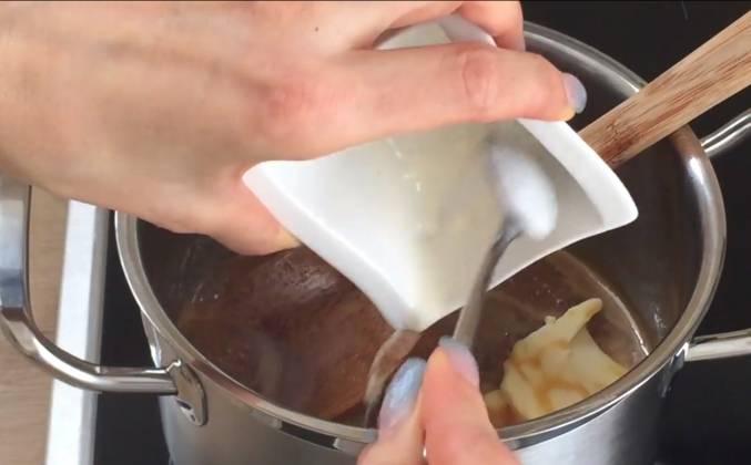 2.  Лучше варить соус при маленькой температуре, понадобится больше времени, но зато вы не испортите карамель. Параллельно нагреваю сливки. Сделать это можно любым способом, в микроволновке или в кастрюльке. Сливки должны быть горячие. Сахар уже почти весь растаял. И теперь надо не упустить момент, когда сахар станет красивого янтарного цвета. Переход от карамели к жжённому сахару происходит очень быстро. Если почувствовали запах жжённого сахара, то вы передержали сахар, он не подойдёт для соуса и его будет надо выбросить. Кастрюльку сниму с огня. У меня получился такой красивый янтарный цвет. Теперь быстро вливаю сливки. Жидкость начинает бурлить, не пугайтесь, так и должно быть.