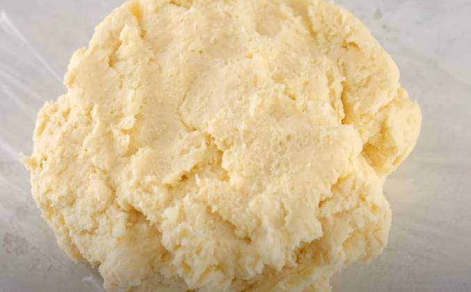 2. Заверните тесто в пищевую пленку и положите в холодильник на 60 минут. Достаньте тесто из холодильника, разделите его на 2 части, одну часть уберите в холодильник. Вторую часть теста раскатайте для вырезки круга диаметром по 26-28 см. Вырежьте тесто диаметром 26-28 см, остатки сомните и уберите в холодильник.