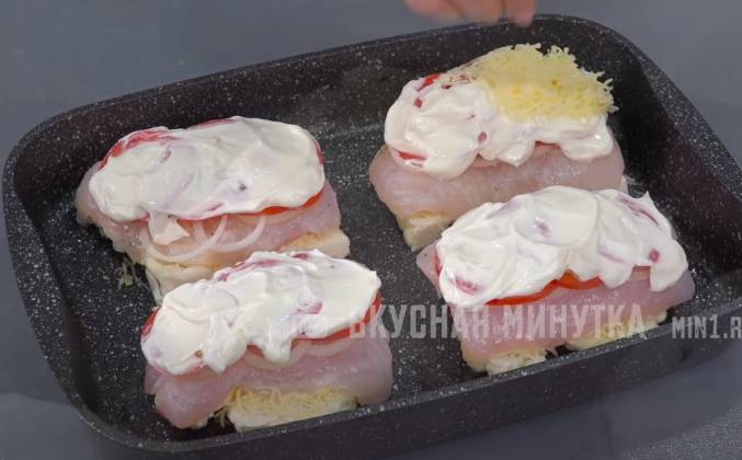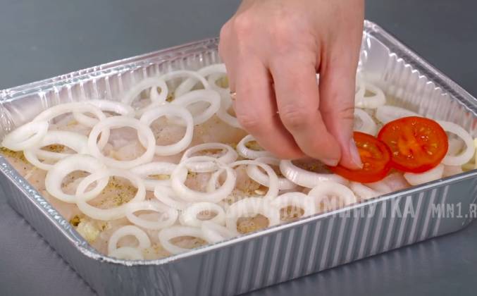 4. Но для запеканки хватит, хотя чем больше рыбы, тем вкуснее, рыбу посыпаю специями, у меня готовая приправа для рыбы, она уже с солью, а дальше точно так же колечки лука и кружочки помидоров, теперь майонез для удобства, я использую кондитерский мешок, но можно и ложкой распределить, конечно ну и сыр по больше запекаю, примерно полчаса, при 180 градусах, если вы так же как и я любите рыбу, ну даже если и не любите вам понравится это блюдо, я уверена, попробуйте это действительно очень вкусно!Видео рецепт ютуб ниже 👇