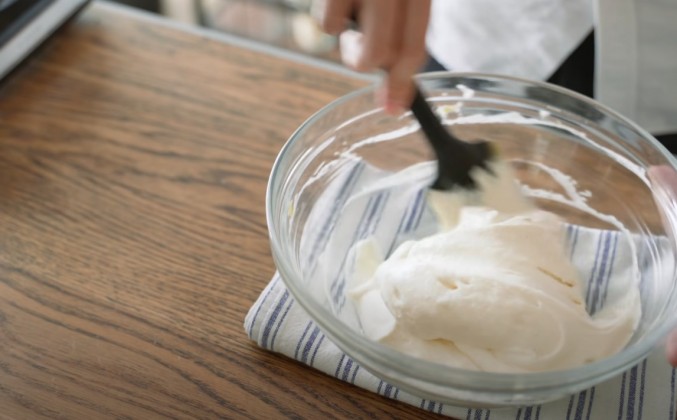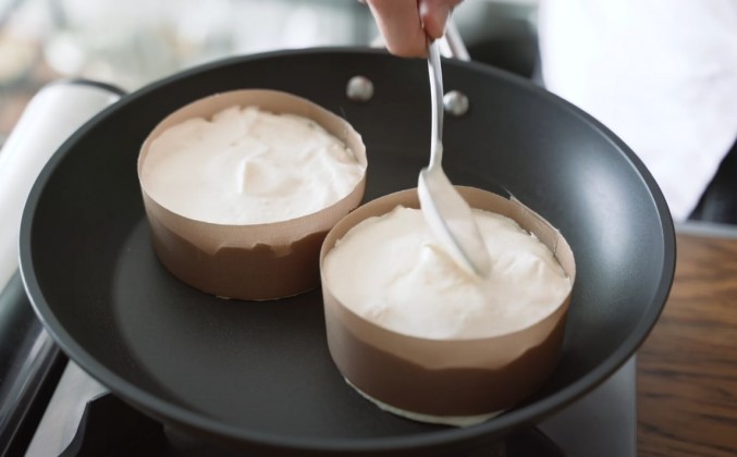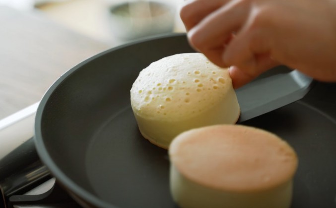 2.  При приготовлении безе следует помнить о том, что нужно использовать чистую посуду без масла и пыли. Пластиковые миски не подойдут, так как с них масло не смывается полностью. Используйте стеклянную миску или из нержавеющей стали. Эти советы могут помочь тем, у кого не получается сделать безе. Добавьте тесто, когда безе вспенено достаточно. Спресуйте тесто в кондитерском мешке, чтобы сделать его плотнее. Если меренга такая плотная, лучше использовать венчик вместо лопатки. В конце несколько раз перемешайте резиновой лопаткой. Вы можете использовать ложку, но с пекарским мешком вы сможете сделать панкейки красивыми. Налейте масло, когда сковорода нагреется. Температура должна быть около 170 °C. Теперь держите сковроду на медленном огне. Добавьте немного воды, накройте крышкой и готовьте на пару. Ждите около 4 минут. 3.  Переверните после того, как тесто застыло. Накройте крышкой и выпекайте ещё 1-2 минуты. Теперь всё готово, но они получились довольно тонкими. Причиной является то, что сыпучих ингредиентов оказалось мало, поэтому панкейки опустятся, даже если их передержать . Они, конечно, пышные и вкусные, но я хочу сделать панкейки гораздо толще! Поэтому я решил сделать форму. Разрежьте лист для выпекания на полоски размером 36 см х 4 см. Сверните и закрепите. 11 см в диаметре. Кроме того, тесто делится на два и плотно раскладывается по формам. Накройте крышкой и выпекайте на слабом огне 4 минуты Выключите огонь и подождите ещё 4 минуты, не открывая крышку. Выпекайте, пока тесто не перестанет прилипать вашим пальцам.