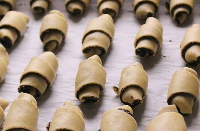 3. Достаньте один диск из холодильника и раскатайте с добавлением муки в круг, диаметром от 35 до 38 см и очень тонким и толщиной 1-2 мм. Смажьте 1/3 начинки, оставляя 1-2 см от краев без начинки. Разрезать на 16 частей и очень аккуратно свернуть рогалики. Разложите на противне, застеленном бумагой для выпечки. Разогрейте духовку до 175°C и выпекайте их около 20 минут, следя за тем, чтобы рогалики не стали коричневыми. Они должны оставаться светлыми или совсем слегка золотистыми.