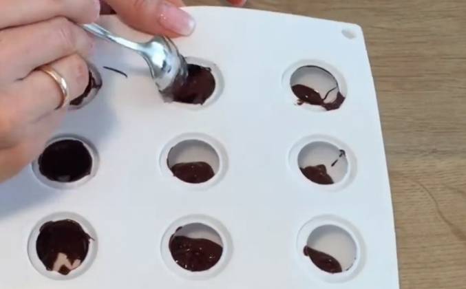 2. Если вы хотите чтобы шоколад был более текучий, не такой густой как у меня, то добавьте больше масла. Мешок вытру насухо и отрежу небольшой кусочек с уголка. Теперь наполню формочки для конфет шоколадом. Нанесу шоколад на бортики и дно формочки так, что бы не оставалось просветов. Равномерно распределю шоколад можно помогая носиком от мешка или маленькой ложечкой. Используя кондитерский мешок очень удобно наносить шоколад в такие крохотные формочки. Большой плюс еще в том, что мы можем растопить шоколад сразу же в кондитерском мешке, не надо сооружать водяную баню и пачкать посуду.