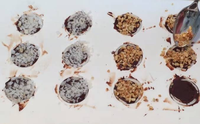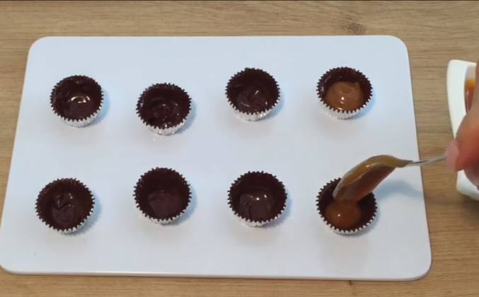 3. Также заполню силиконовую форму. Налью понемногу шоколада в ячейки, ложкой распределю его по бокам, затем заполню дно и залью просветы. Если вы тоже будете использовать силиконовую форму, то обратите внимание, что бы слой шоколада был везде равномерный, без тонких мест. Иначе вы можете повредить конфеты, когда будете их доставать из формы. На первый слой у меня ушло около 2\3 всего шоколада. Поставлю формочки в холодильник на 10 минут. Шоколад в формочках застыл и теперь наполню их начинкой. В половину формочек положу карамельный соус, оставляя сверху место для слоя шоколада. Вторую половину формочек заполню кокосовой стружкой и положу по целому, в алюминиевые формочки по половине миндального ореха.