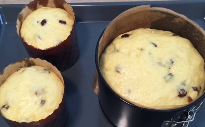 5. Я буду печь один большой кулич в разъёмной форме диаметром 16 см. и два маленьких в бумажных формочках высотой и диаметром 9 см. Разъёмную форму я проложила бумагой для выпечки, на дно и стенки. Возьму часть теста, скатаю шариком и положу в формочку швом вниз. Тесто должно заполнить формочку на треть. Если вы будете печь в таких же небольших бумажных формочках, то теста хватит на 5-6 штук. Теста у меня получилось всего 1270 гр. Снова поставлю тесто в тёплую духовку подойти. Туда же поставлю мисочку с горячей водой. Через 45 минут, куличи поднялись и готовы к выпечке. Выпекать буду 15 минут при температуре 200, затем уменьшу до 180 верхний и нижний жар. Маленькие выпекаются в зависимости от духовки 30-40 минут, большие 45-55 минут.