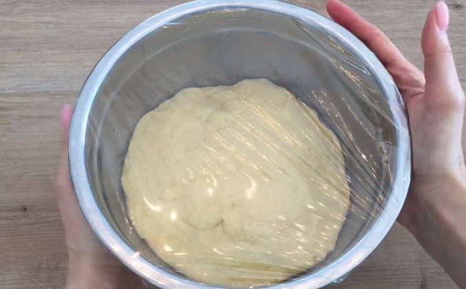 4. Миску затяну пищевой плёнкой и поставлю тесто в тёплое место подходить. Если в кухне тепло, то можно оставить на столе или поставить в духовку. Я нагрела её до 50, выключила и поставлю тесто внутрь, туда же поставлю мисочку с горячей водой, чтобы внутри было тепло и влажно. Изюм надо помыть, отбросить на дуршлаг и положить просохнуть на бумажном полотенце. Через 2 часа тесто хорошо подошло и заметно увеличилось в объёме. Вот теперь я добавлю в тесто высохший изюм. Руки я смазала растительным маслом и сначала обомну тесто, затем вмешаю изюм. Если захотите сделать классический панеттоне, но добавьте к изюму ещё 150 гр. цукатов. Тесто получается очень мягкое, эластичное, красивого жёлтого цвета. Оно не липнет к рукам и легко месится.