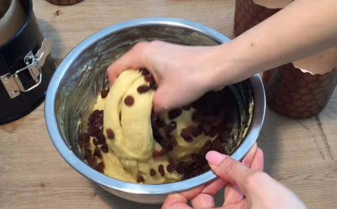3. Миску затяну пищевой плёнкой и поставлю тесто в тёплое место подходить. Если в кухне тепло, то можно оставить на столе или поставить в духовку. Я нагрела её до 50, выключила и поставлю тесто внутрь, туда же поставлю мисочку с горячей водой, чтобы внутри было тепло и влажно. Изюм надо помыть, отбросить на дуршлаг и положить просохнуть на бумажном полотенце. Через 2 часа тесто хорошо подошло и заметно увеличилось в объёме. Вот теперь я добавлю в тесто высохший изюм. Руки я смазала растительным маслом и сначала обомну тесто, затем вмешаю изюм. Если захотите сделать классический панеттоне, но добавьте к изюму ещё 150 гр. цукатов. Тесто получается очень мягкое, эластичное, красивого жёлтого цвета. Оно не липнет к рукам и легко месится.