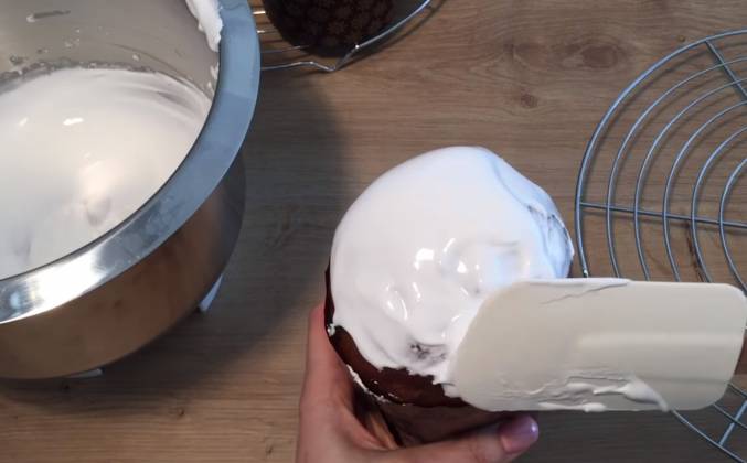 6. Классические панеттоне перед выпечкой надрезают ножом на крест и в серединку кладут кусочек сливочного масла. Я этого делать не буду, чтобы верхушка была ровной. Когда большой кулич будет почти готов, сделаю глазурь. Взобью белок с сахарной пудрой и чайной ложкой лимонного сока. Глазурь должна быть вот такой консистенции, ещё текучей и сильно блестеть. Куличи я достала из духовки. Маленькие выпекались 32 минуты, большой 47 минут. В любом случае надо обязательно проверить готовность деревянной палочкой. Чтобы куличи сверху не пригорели, можно накрыть их бумагой для выпечки. Горячие куличи накрою влажной бумажной салфеткой и сверху полотенцем на 5 минут. Ещё горячие куличи украшу глазурью.