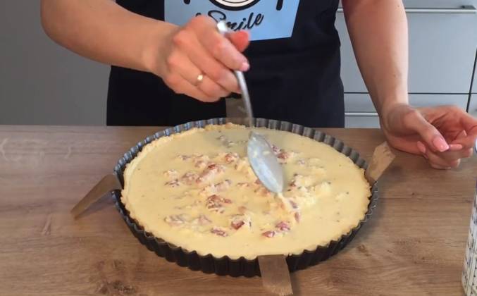 3. Пока выпекается корж подготовлю начинку. Бекон порежу полосочками или можно кубиками. Обжарю его пару минут на сухой сковородке. Поставлю остывать. Приготовлю заливку. В мерную кружку разобью яйца. В зависимости от размера 3 крупных или 4 мелких. Волью сливки и хорошо размешаю венчиком. Затем всыплю тёртый сыр, соль перец и мускатный орех, размешаю. Добавлю остывший бекон. Когда будете солить учитывайте что сыр и бекон тоже солёные. Корж пропёкся, теперь я вылью на него начинку и распределю равномерно бекон и сыр.