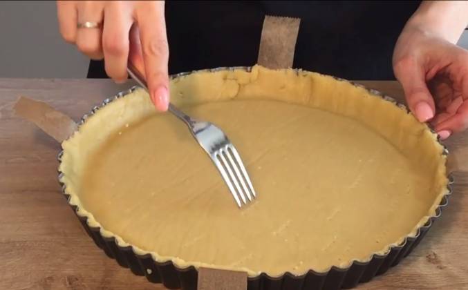 2. Я буду выпекать в форме диаметром 28 см. Конечно можно взять разъёмную форму меньшего диаметра, тогда пирог получится выше и надо будет лишь скорректировать время выпечки. Я слегка смазала дно формы растительным маслом. Накрест положу две длинные бумажные полоски и на них кружок из бумаги. Так мне будет удобно вынуть пирог из формы не поддевая его. Раскатанное тесто перекладываю вместе с бумагой в форму, тестом вниз, аккуратно сниму бумагу и распределю тесто по бортикам. Лишнее срежу ножом по верху бортика формы. В небольшой разъёмной форме делайте бортик из теста высотой где-то на три пальца. Корж обильно наколю вилкой и поставлю выпекаться в предварительно разогретую духовку на 200̊ верхний\нижний жар посередине на 15 минут.