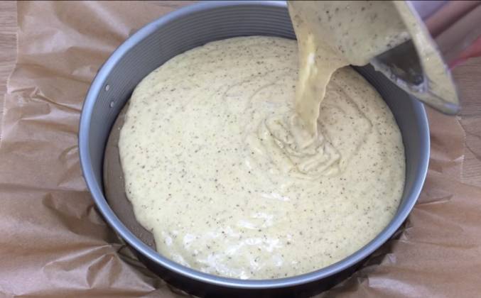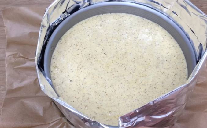 3. На дно формы я проложила бумагу для выпечки. Дно смажу небольшим количеством растительного масла. Бортики формы не надо смазывать маслом, так бисквиту будет легче подниматься, держась за бортики. В форму вылью тесто и разровняю лопаткой. Чтоб бы бисквит получился ровный без бугорка применим маленькую хитрость. Я возьму бумажное кухонное полотенце, длиной достаточной, что бы обернуть мою форму, намочу его, слегка отожму и положу по середине на кусок алюминиевой фольги, он должен быть длиннее, чем бумага. Оба края фольги заверну внутрь, закрывая бумагу. Получившейся алюминиевой лентой оберну бортик формы и плотно зажму два конца вместе, что бы конструкция на ней плотно держалась. Благодаря этой конструкции тесто у бортика формы не будет нагреваться сильнее, чем в середине, бисквит поднимется равномерно и испечётся ровным, без горки.