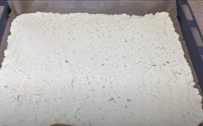 2. Тесто получается очень мягкое и эластичное, не липнет к рукам и легко раскатывается, его можно даже растянуть руками. Творожное тесто напоминает дрожжевое, но делается намного проще и быстрее, т.к. не надо ждать пока тесто подойдёт. Бумагу с тестом переложу на противень. Теперь подготовлю начинку. Стебли ревеня помою и вытру насухо. Обязательно надо отрезать верхнюю и нижнюю его части. Чистить стебли не надо. Всего нам необходимо 1,5 кг. начинки. Часть ревеня я заменила клубникой. Можно делать только с ревенем. Подготовленные стебли порежу на кусочки длиной 1-1,5 см. Нарезанный ревень выкладываю на тесто. Затем подготовлю клубнику. Удалю плодоножки и порежу клубнику на кусочки. Выложу сверху на ревень.