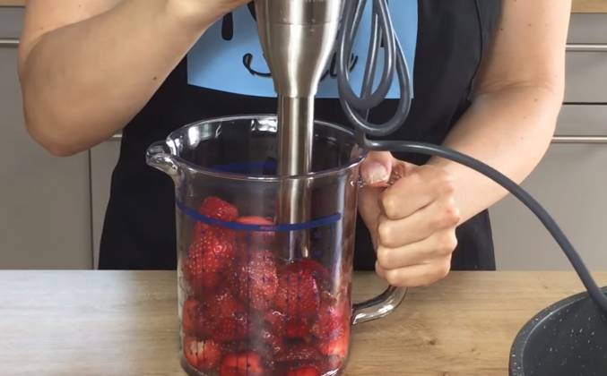 2. Тогда пюрируем половину клубники, а вторую половину мелко нарезаем, всё засыпаем желирующим сахаром, размешиваем и оставляем настояться на 3 часа или лучше на ночь. Последний ингредиент это 100 гр. чёрного шоколада, у меня 56%. Его надо мелко порубить ножом. Перед использованием желирующий сахар 1 к 2 надо хорошо размешать. Пектин очень мелкий порошок и имеет особенность осыпаться вниз пачки. Т.к. работает он хорошо только соединившись вместе с сахаром, надо всегда перед использованием хорошо мешать. Клубнику я переложила в кастрюлю, туда же засыпаю желирующий сахар, мешаю. Следом высыпаю рубленный шоколад и мешаю. Шоколад можно и не добавлять, количество остальных ингредиентов не меняется. Кастрюлю ставим на плиту на высокую мощность. Кастрюля должна быть с толстым дном, иначе варенье подгорит. Ещё важно, что заполнять кастрюлю можно лишь на половину, потому что во время варки варенье поднимется и будет пенится. Всё время помешивая деревянной ложкой, ждём пока масса закипит.