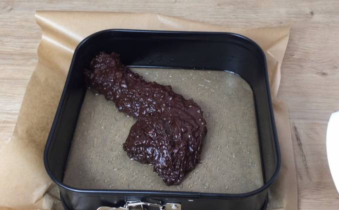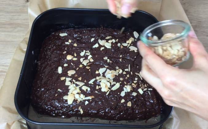 2. Теперь буду мешая добавлять по две ложки сухой смеси. В итоге должно получиться такое тугое однородное мега шоколадное тесто. В квадратную разъёмную форму для выпечки я положила бумагу, смажу дно и бортики небольшим количеством растительного масла. Выложу тесто. Рецепт рассчитан на форму 20х20 см., поэтому я выложу тесто на 2/3 формы. Так как тесто не текучее, можно выложить не на всю форму или выпекать на противне, загнув края бумаги на верх как бортики. Распределю по форме лопаткой. Высота теста должна быть около 2 см. У меня осталось немного обжаренных лепестков миндаля я украшу ими мои брауни.