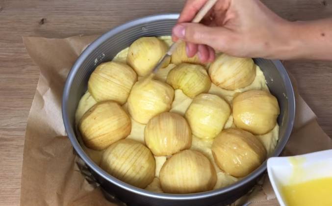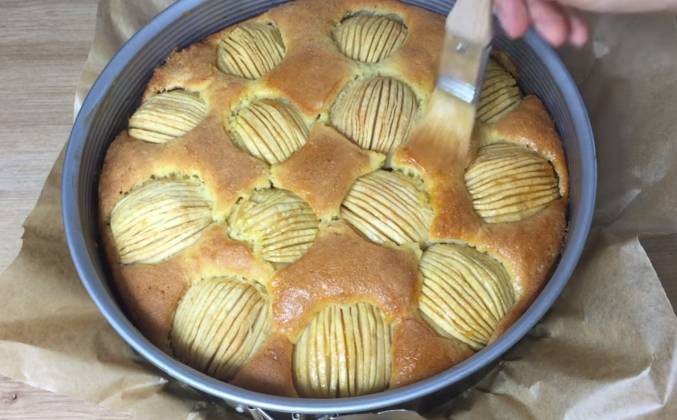 4. Тесто хорошо поднялось и теперь чётко видны наши насечки на яблоках. Смазываем ещё горячий пирог сразу после того как достали его из духовки. Обильно яблоки и слегка тесто. И оставляем пирог остывать. А теперь разрежем пирог и посмотрим как он выглядит в разрезе. Красивое пышное тесто и кусочки хорошо пропёкшихся мягких яблок. Очень нежный и ароматный. Кстати по этому же рецепту можно испечь пирог с грушами или вишней. Приятного аппетита!Видео рецепт ютуб ниже 👇