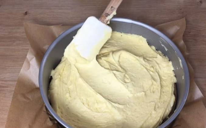 2. Масло я достала заранее из холодильника и нарезала кубиками. Продолжая взбивать буду постепенно всыпать 125 гр. сахара смешанного с 2 ч.л. ванильного сахара и щепоткой соли. Добавлю натёртую цедру с половинки лимона и размешаю. Теперь буду продолжая взбивать добавлять по очереди 3 яйца, взбивая каждое по пол минуты. Следующим шагом я смешала 200 гр. муки с 2 ч.л. без верха разрыхлителя. Всыплю половину муки и размешаю на низкой скорости. Волью 2 ст.л. молока и размешаю. В последнюю очередь всыплю оставшуюся муку и размешаю. Моё тесто готово. Выпекать пирог буду в разъёмной форме для выпечки диаметром 26 см. На дно формы я положила бумагу для выпечки и смазала небольшим количеством растительного масла без запаха. Тесто выложу в форму и разровняю.