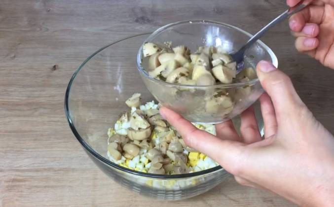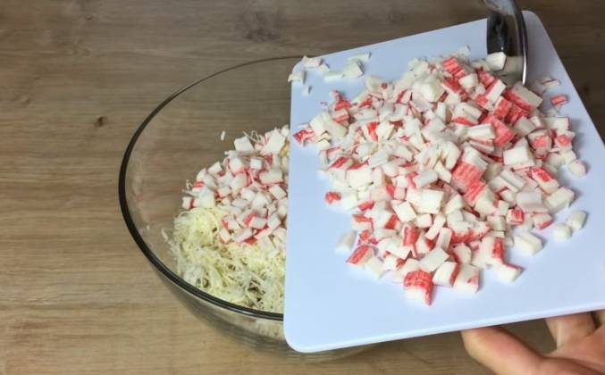 Как приготовить Вкусный салат с сыром, маринованными грибами и крабовыми палочками рецепт пошагово