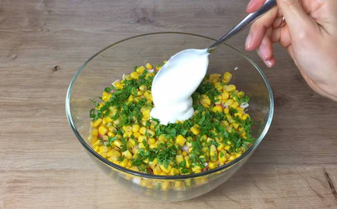 Вкусный салат с сыром, маринованными грибами и крабовыми палочками с кукурузой, выложенный слоями и заправленный кукурузой.