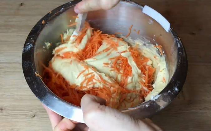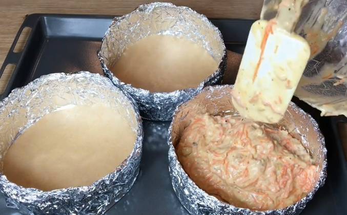 2. Мешаю лопаткой аккуратно, чтобы не убить весь объем, движениями снизу вверх поворачивая чашу миксера. Всыпаю всю морковь сразу и аккуратно размешиваю. Ещё нам понадобится 150 гр. орехов. Я взяла по 50 гр. рубленных орехов, это грецкий орех, миндаль и лесной орех. Орехи можно заменить по своему вкусу, но берите минимум два вида, орехи очень обогащают вкус коржей. Орехи также высыпаю в тесто и размешиваю до однородности. Теста у нас достаточно для трёх коржей диаметром 16-18 см. Так как мало у кого есть в хозяйстве 3 формы одинакового диаметра, я сделаю их из фольги. Два куска фольги положу накрест и оберну ими кольцо нужного диаметра и плотно прижму. Вынимаю кольцо и прокладываю на дно кружок бумаги для выпечки. Выпекать коржи я буду одновременно. Равномерно распределю тесто по трём формам.