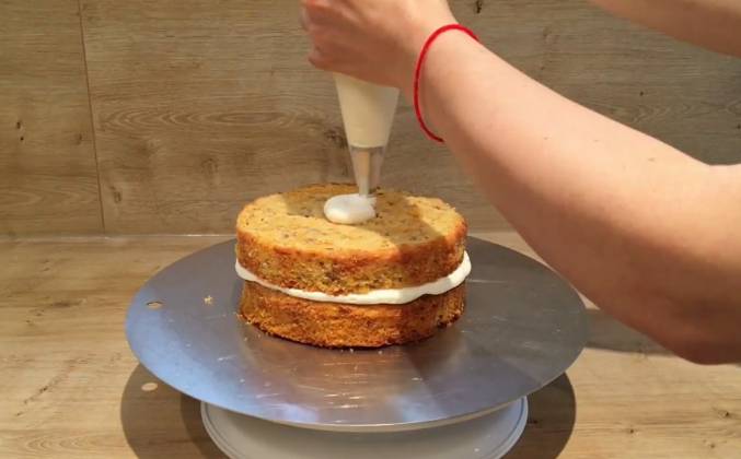 4. Морковные коржи плохо режутся, поэтому их и лучше выпекать отдельно иначе при разрезании корж будет неровными, бугристыми. Прослаивать торт я буду крем-чизом со сливками. Как приготовить этот крем я уже рассказывала, повторять не буду, а оставлю ссылку на видео-рецепт внизу под этим видео. Крем по этому рецепту получается белоснежным, он хорошо держит форму, очень вкусный с легчайшим солёным привкусом. Готовый крем перекладываю в кондитерский мешок с круглой насадкой и ставлю в холодильник на 30 минут стабилизироваться. Собираю торт. На каждый корж выкладываю слой крема. Мне удобнее сделать это из мешка, так каждый слой крема получается одинаковой высоты. Морковные коржи получаются очень влажными и не требуют дополнительной пропитки.