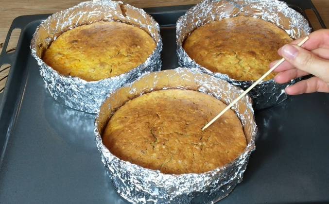 3. Я взвесила тесто и у меня получилось по 475 гр. в каждую формочку. Морковное тесто мы выпекаем отдельными коржами, что бы коржи хорошо и главное равномерно пропеклись. Ставлю выпекаться в предварительно разогретую до 180С духовку на приблизительно 40 минут. Готовность обязательно проверяем деревянной палочкой, т.к. время выпечки в каждой духовке различно. Если палочка вышла сухой, коржи готовы. Коржи немного остыли, я вынула их из наших импровизированных форм и оставлю остывать на решётке. Полностью остывшие коржи отдельно друг от друга оборачиваю в пищевую плёнку и ставлю в холодильник минимум на 5 часов, а лучше на ночь, чтобы они стабилизировались и влага равномерно распределилась внутри. На следующий день достаю коржи. Они у нас получились красивые, одинаковые, мягкие, высокие и с небольшой горкой. Неровную верхушку я срежу. Вот такой классный, яркий и ароматный корж получается. Где необходимо минимально подрежу по бокам.