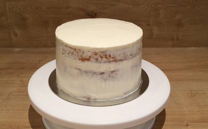 5. Если вы любите очень сладкие торты, то можно дополнительно полить каждый корж сливочной карамелью. Ссылку на её рецепт я также оставлю внизу под видео. Торт я собрала, в последнюю очередь промажу бока небольшим количеством крема, что бы закрепить все крошки, иначе когда мы будем наносить финальный слой крема он у на получится с крошками. Торт ставлю в холодильник на полчаса. Через полчаса нанесу на бока торта оставшийся крем и выровняю торт. На торт можно нанести спатлой какой-то узор или оставить бока ровными. Я выровняла торт, получился такой интересный полуголый вариант с просвечивающимися через крем коржами.