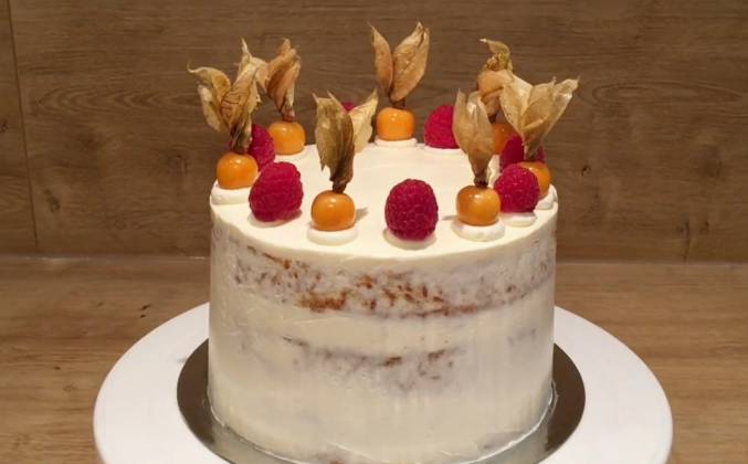 6. Остатками крема и ягодами малины и физалисом украшу мой тортик. Наш морковный тортик готов, теперь его надо поставить на несколько часов в холодильник на пропитку. У меня нет времени ждать пока торт пропитается, так как уже темнеет. Поэтому я разрежу торт сейчас и покажу вам, каким он получился изнутри. Вот такой шикарный разрез у нас получается. Нежные, мягкие по-осеннему красивые коржи и вкуснейший сливочный крем. Очень советую испечь такое чудо и порадовать себя и своих любимых вкуснейшим десертом. Приятного аппетита!Видео рецепт ютуб ниже 👇