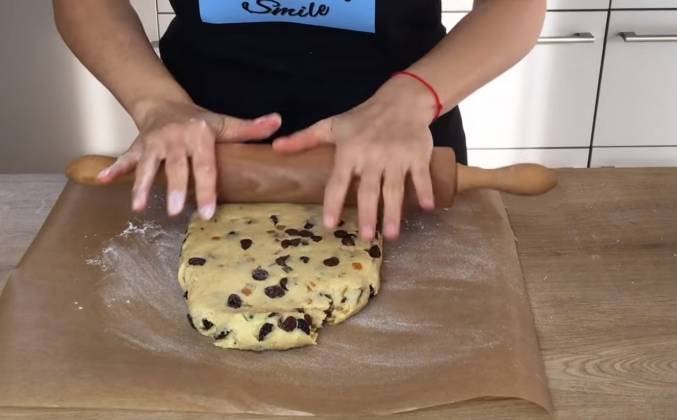 3. Выложу тесто, сделаю из него лепёшку, положу на него цукаты и изюм. Если в изюме осталась невпитавшаяся жидкость, её надо предварительно слить. Мы не вымешиваем тесто, а лишь равномерно распределяем изюм и цукаты по нему. Тесто немного липкое, что бы оно не так липло к рукам и столу, можно молотый миндаль вмешивать также на этом этапе вручную вместе с цукатами и изюмом, а не добавлять его заранее. У меня получилось такое красивое, очень ароматное тесто. Разделю его на части. Буду выпекать один большой штоллен и два поменьше. Штоллен имеет традиционно особую форму. Бумагу для выпечки припудрю мукой. Скалкой раскатаю тесто в продолговатый, высокий овал. Теперь скалкой сделаю углубление в длину по середине овала.