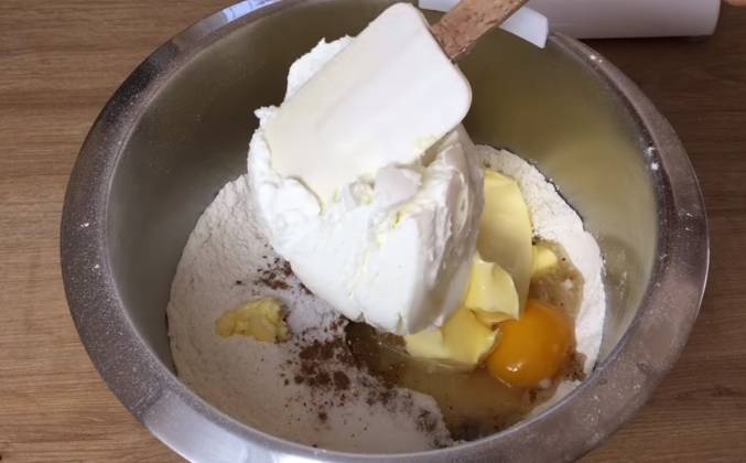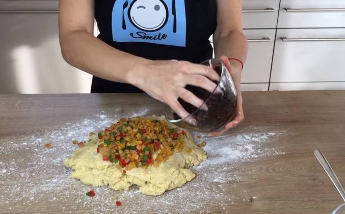 2. Пряности в штоллене очень важны. Я купила уже готовую смесь для штоллена. Можно сделать и самим. Смешать по щепотке молотой гвоздики, имбиря, кардамона, мускатного ореха и неполную ч.л. корицы. Разобью 2 яйца и добавлю масло, которое стоит у меня на столе ещё с вечера. Ещё 250 гр. нежирного творога и 250 гр. молотого очищенного миндаля, натру цедру с одного апельсина, снимая только верхний слой. Ставлю размешиваться насадкой крючок на невысокой скорости. Тесто мешаем недолго, до однородности. Ещё нам понадобится 200 гр. лимонных и апельсиновых цукатов нарезанными небольшими кубиками. У меня было немного меньше, поэтому я добавила ещё вишнёвые цукаты. Теперь домешиваем тесто на столе, слегка присыпанном мукой.