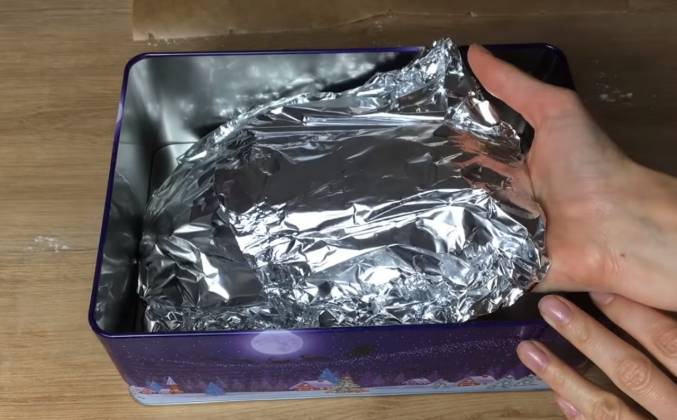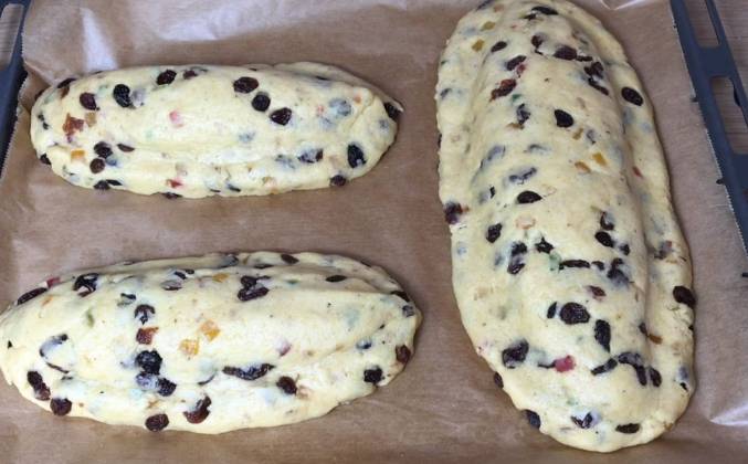 4. Одну часть перекладываю сверху на другую внахлёст на 2/3. Снова придаю форму овала, с этой части прижимаю, а с другой стороны делаю ребром ладони такое же углубление. Получается чётко выраженный бугорок по всей длине штоллена. Весь изюм, который торчит на поверхности надо вдавить внутрь, иначе при выпечке он сгорит. Штоллен перекладываю на противень, на который я положила бумагу в несколько слоёв. Также я сформировала ещё два штоллена поменьше и переложила их на противень. Духовку надо предварительно разогреть 220С конвекция или 250С верхний/нижний жар. Штоллены ставлю в нижнюю треть духовки и сразу же уменьшаю температуру до 140С конвекция и 160С верхний/нижний жар. Два меньших штоллена я выпекала 45 минут. Большой штоллен около часа.