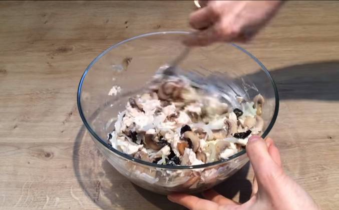 3. Теперь смешаем нарезанное мясо, жаренные грибы, маринованные лук, который я отбросила на дуршлаг, что бы не осталось воды и нерезаный чернослив. Посолю и поперчу по вкусу. Добавлю 2-3 столовые ложки майонеза и размешаю. На мой вкус этого вполне достаточно, но можно конечно же полностью залить салат майонезом, если душа желает. Готовый салат украшаем и можно сразу же подавать к столу. Приятного аппетита.Видео рецепт ютуб ниже 👇