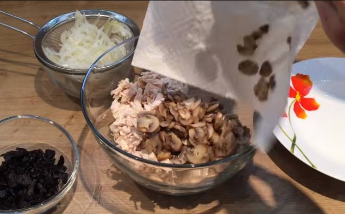 2. Грибы я не мою, а тщательно вытираю бумажными полотенцами, снимая верхнюю пленочку. Нарежу грибы тонкими кольцами. На сковороде разогрею немного растительного масла и обжарю грибы со всех сторон до золотистости. В конце посолить и поперчить по вкусу. Готовые грибы перекладываю на тарелку с бумажным полотенцем, что бы лишний жир впитался и оставлю остывать. Пока грибы жарятся нарежу две варенные куриные грудки, около 450 гр. на кусочки размером с грибы. 10 крупных штучек чернослива промою горячей водой, вытру бумагой и нарежу полосочками.