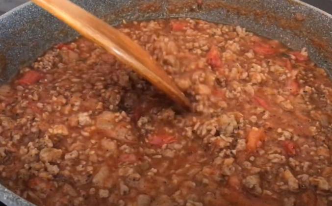 2. Нарезать лук. Обжарить его на оливковом масле до золотистого цвета. Затем добавить к луку фарш и жарить на высоком огне до готовности фарша. Когда фарш обжарится – добавить сюда приготовленный ранее томатный соус. Посолить, поперчить и тушить на медленном огне около 10 минут, пока жидкость слегка не выпарится. В конце добавить сушеный базилик.