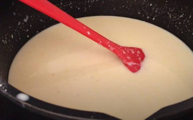 3. Приготовим соус бешамель. В сотейнике растопить сливочное масло, добавить муку – перемешать до объединения. Затем понемногу влить всё молоко, постоянно помешивая. Венчиком разбить комочки. Далее мешаем лопаткой до загустения соуса. Добавить мускатный орех и соль к соусу. Форму смазать сливочным маслом.