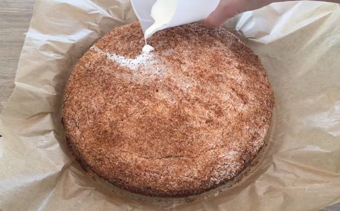 3. Если ваша духовка сильно греет сверху, то при выпечке накрывайте пирог листом бумаги. Пирог я вынула из формы, отклеила дно пирога от бумаги и ещё горячим пропитаю 200 гр. пастеризованных сливок жирностью от 30%. Сливки я перелила для удобства в стакан с носиком и равномерно пропитаю ими пирог сверху и по бокам. Затем оставлю пирог остывать на решётке. Остывший пирог разрежу и покажу вам каким он получился. Внутри пирог получился воздушным и пористым. Сливки хорошо его пропитали и корочка также стала мягкой. Очень вкусно съесть кусочек кокосового пирога с чашечкой ароматного чая. Приятного аппетита!Видео рецепт ютуб ниже 👇