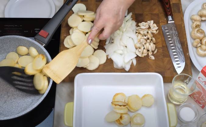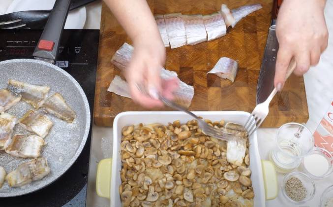 2. А пока грибы жарятся, подготовим рыбку. Две тушки минтая я заранее почистила, удалила хвост, плавники и внутреннюю черную пленку. Вдоль по хребту срезаем филе с двух сторон. Обжаренные грибы выкладываем в форму поверх лука. Филе рыбки нарезаем на кусочки, выкладываем кожей на горячую сковородку и обжариваем на растительном масле до полуготовности с двух сторон. Золотистую рыбку выкладываем в форму на овощи. Подготовим соус-заливку. В миску выливаем примерно 0,5 литра сливок любой жирности слегка присаливаем рыбу и еще немного соли добавляем в соус. Кроме соли, рыбку и соус присыпаем черным перцем - у меня с ароматом лимона. Добавляем в сливки любую приправу для рыбы.