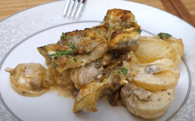 Запеченная рыба с грибами и овощами в сливочном соусе