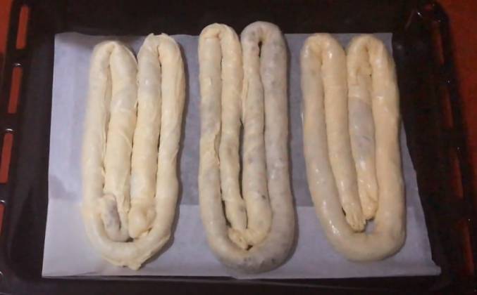 5. Растянув тесто на нужную длину, подворачиваем края теста во внутрь, удаляем толстое тесто оставшееся на самом краю. Если толстое тесто не удалить то при формировании Бёрека у Вас не получится равномерной красивой формы. Подгибаем тесто с третьей стороны, так же удаляем толстый край. Выкладываем на край теста немного мясной начинки либо шпинат с сыром, оборачиваем начинку тестом и начинаем сворачивать Бёрек. Свернув Бёрек удаляем толстое тесто с четвертого края, сворачиваем тесто в жгут и придаем традиционную форму Турецкого Бёрека. Выкладываем на лист, смазываем желтком с добавлением масляной смеси. Выпекаем Бёрек в заранее разогретой до 180 градусов духовке в течении 30 минут. Пока Бёрек не приобретет аппетитную румяную корочку. Готовый Бёрек нарезаем на части. Приятного Аппетита!!!Видео рецепт ютуб ниже 👇