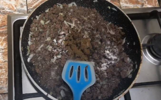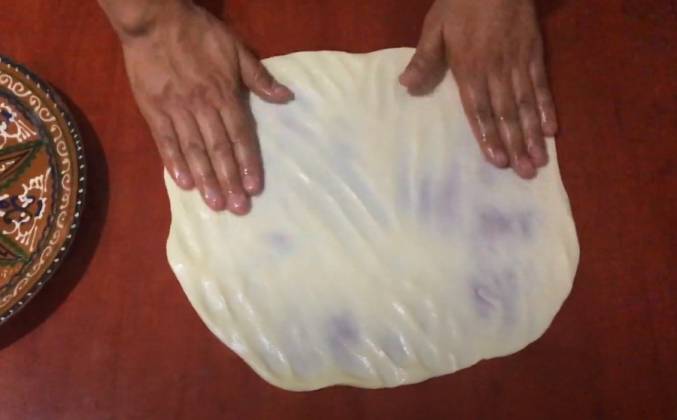 3. Смазанное тесто накрываем пищевой пленкой и убираем отдохнуть минимум еще на 2 - 2,5 часа. При желании тесто может отдыхать до 5 часов! ВАЖНО!!! ЧЕМ ДОЛЬШЕ ТЕСТО ОТДЫХАЕТ ТЕМ ЛУЧШЕ ОНО БУДЕТ ТЯНУТЬСЯ!!! Через 2,5 часа достаем тесто и приступаем к его раскатке. Смазываем маслом стол, берем лепешку и раскатываем её в тонкий блин толщиной примерно 5 миллиметров, выкладываем блин на широкое блюдо, смазываем масляной смесью. Так поступаем со всем тестом. Раскатанное и смазанное тесто укладываем друг на друга стопкой, накрываем пищевой пленкой и даем отдохнуть еще 10 - 15 минут. Пока тесто настаивается приготовим начинку. Обжариваем фарш, добавляем нарезанный мелким кубиком лук доводим до готовности. В конце добавляем 3 чайные ложки соли, молотый черный перец и молотую зиру. Все хорошо перемешиваем. Даем мясной начинке немного остыть. Начинку из шпината готовим еще проще.