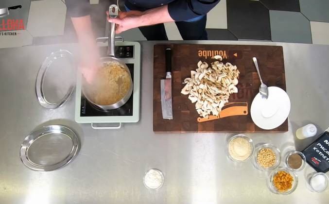 2. Для этого наливаем в сотейник растительного масла грамм 50-70. Ждем когда оно нагреется. Сначала я обжарю лук. Обжариваем лук до золотистого цвета. Посолим его по вкусу. Лук у нас подрумянился. Есть два варианта - либо лук выкладываем на отдельную посуду и пережариваем отдельно грибы. Я так и поступил. Потому что с луком грибы не обжарятся. Либо можно было взять отдельную сковородку и обжарить грибы. Добавим масло и отправляем грибы. Не смотрите что их так много. Они ужарятся. Их будет практически незаметно. Аромат грибочков. Если бы это было не постное блюдо - сюда добавить сливок, взбить блендером и будет крем-суп. Вот и грибочки уже практически на самом дне. Изначально казалось - большой объем. Возьмем пол ложке муки и прямо с грибочками её пожарим. Отправляем лук.