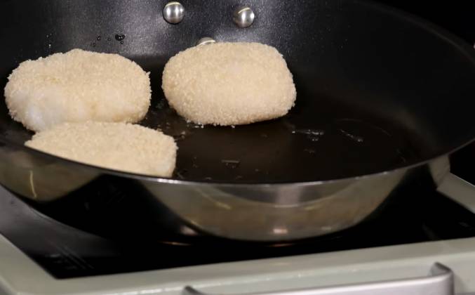 4. Пока масло нагревается, формируем котлеты. В рис добавляем масло, чтобы было удобнее сформировать котлеты и формируем одинакового размера шарики. Сформированные шарики обваливаем в сухарях. Придаем им форму. И отправляем на сковороду. Со стакана риса у меня получилось 10 котлет. Котлеты обжариваем с двух сторон до румяной корочки. Так как рис готов, это занимает буквально с каждой стороны по полторы-две минуты. Нагрев сковороды, друзья, средний. Переворачиваем и обжарим со второй стороны. Подогреем наш соус. Вот такие румяные котлетки получаются. Соус согрелся, друзья. Котлетки готовы. Берем котлету. Вторую. А рядом выкладываем соус. Орехово-грибной.