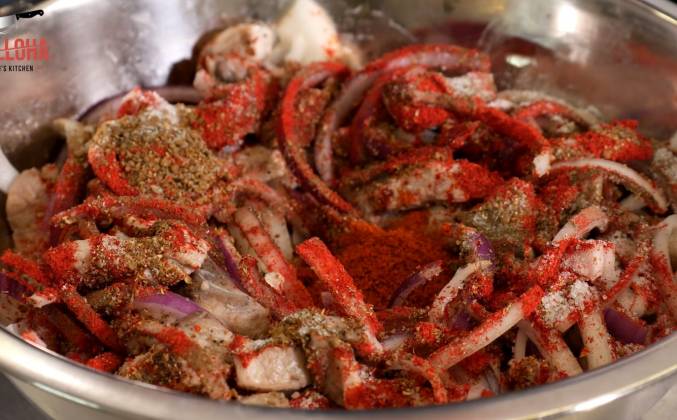 5. Он по национальности кореец. Вот тогда он готовил Хе. Мы проходили обучение в Дмитровской области, посёлок Рыбный. И там у них есть пруды. Он купил 2 карпов и готовил Хе. В принципе, он меня и научил как его делать. Отправляем на это количество рыбы, 2 столовые ложки красной паприки сладкой. Она придаст Хе аромат. Добавляем жареный кориандр молотый. Полторы ложки. Чёрный молотый перец. Чайную ложку. Но вы смотрите по вкусу. Мне нравится черный перец. Тем временем помешиваем лук. Нам нужно обжарить до золотистого цвета. Добавим немного жар. 2 столовые ложки сахарного песка без горочки. Ингредиенты я еще укажу подробно в описании. Освобождаем в середине место, но не до дна. Добавим острый перец чайную ложку с горкой.